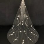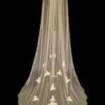 This beautiful chapel length bridal veil has the wow-factor with its hand-embellished floral lace motifs. Handcrafted from a single layer of ivory tulle this veil has a raw edge with the detail beginning half way down the veil. Each motif is decorated with sequins to give a lovely light-catching shimmer. The gorgeous floral motifs create a striking V shape as the focal point in the centre of the train.