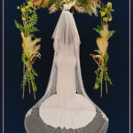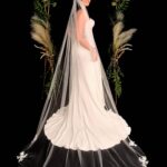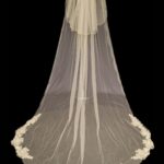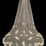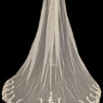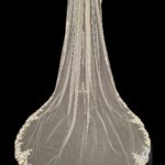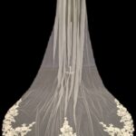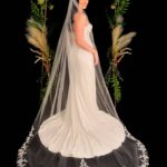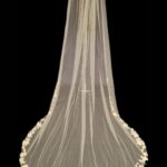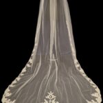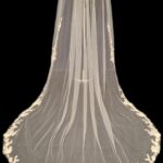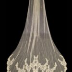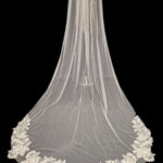 This veil gives the whole wow factor, a beautiful floral lace design which starts from the comb and continues all the way along the edge of the veil. Single Tier only Available in 100″ 116″
