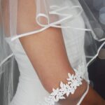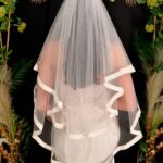 Organza ribbon edged veil with an evenly spaced centre piece lace motif.