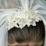 A raw cut edged veil with a beautiful 3D floral motif, added Crystals in the flower centres for extra decoration, finished with added embroidery.
