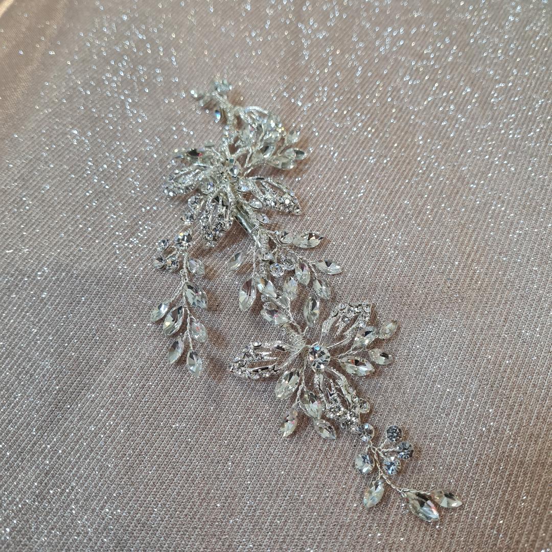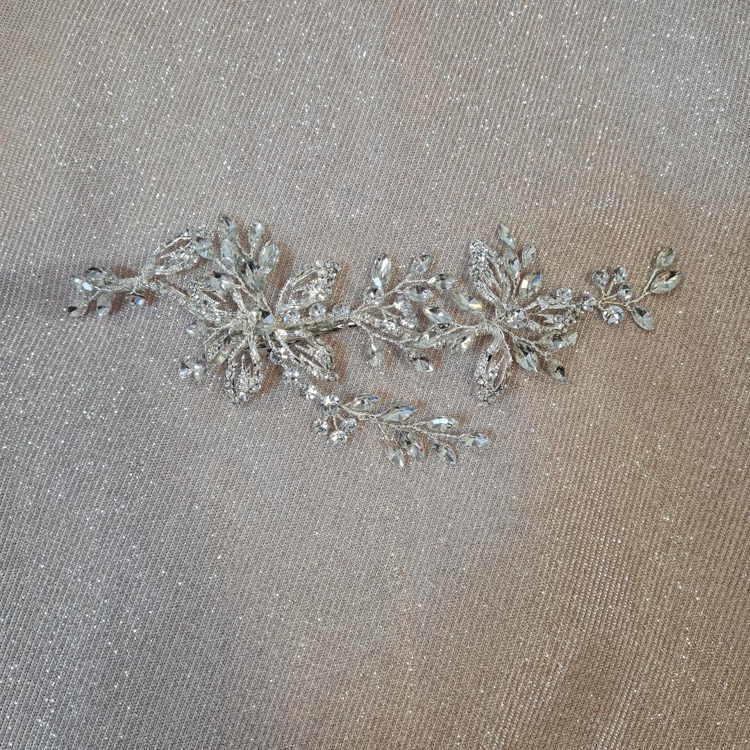 This stunning hair piece is encrusted with a diamante flower and leaf Design