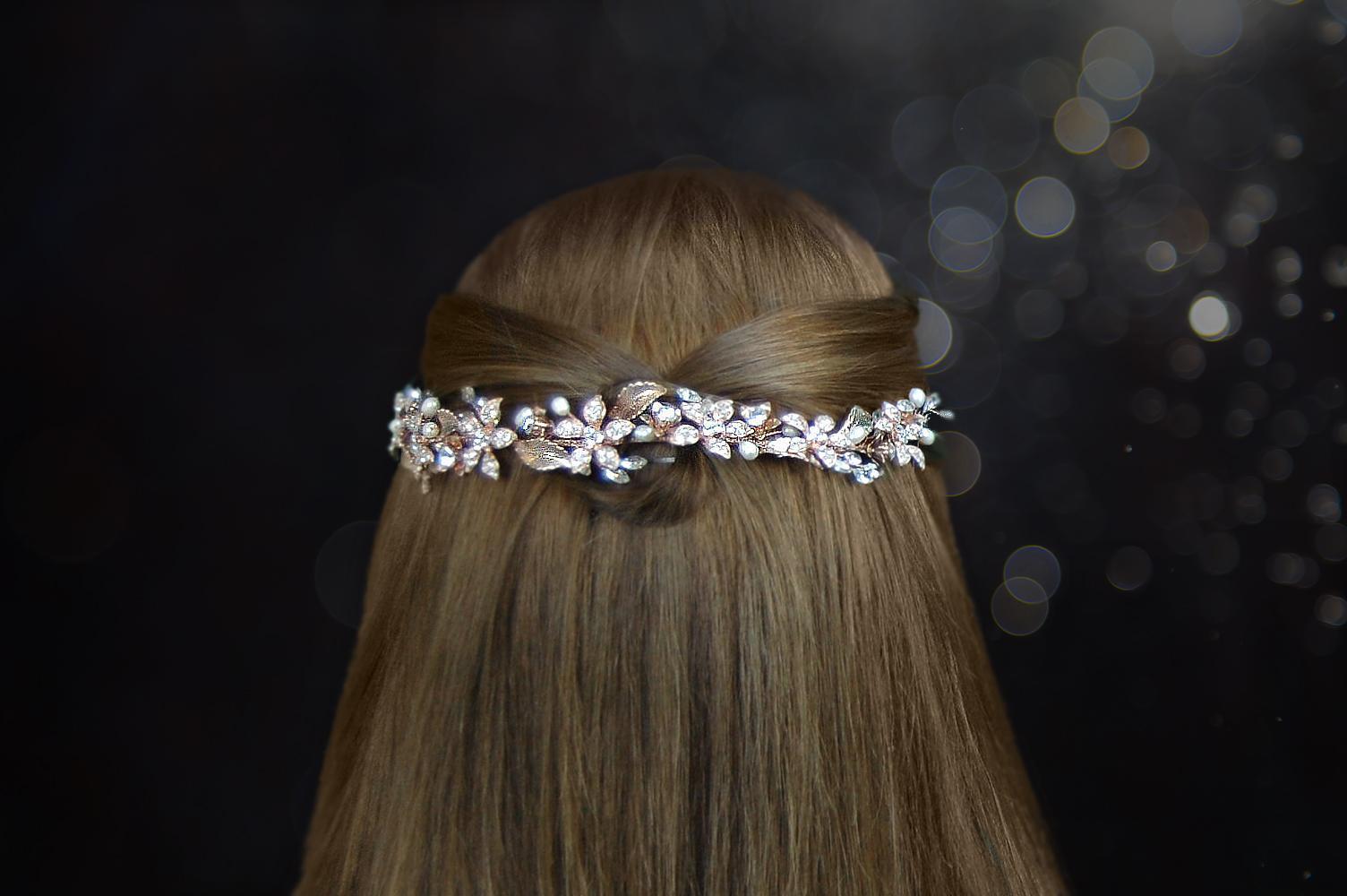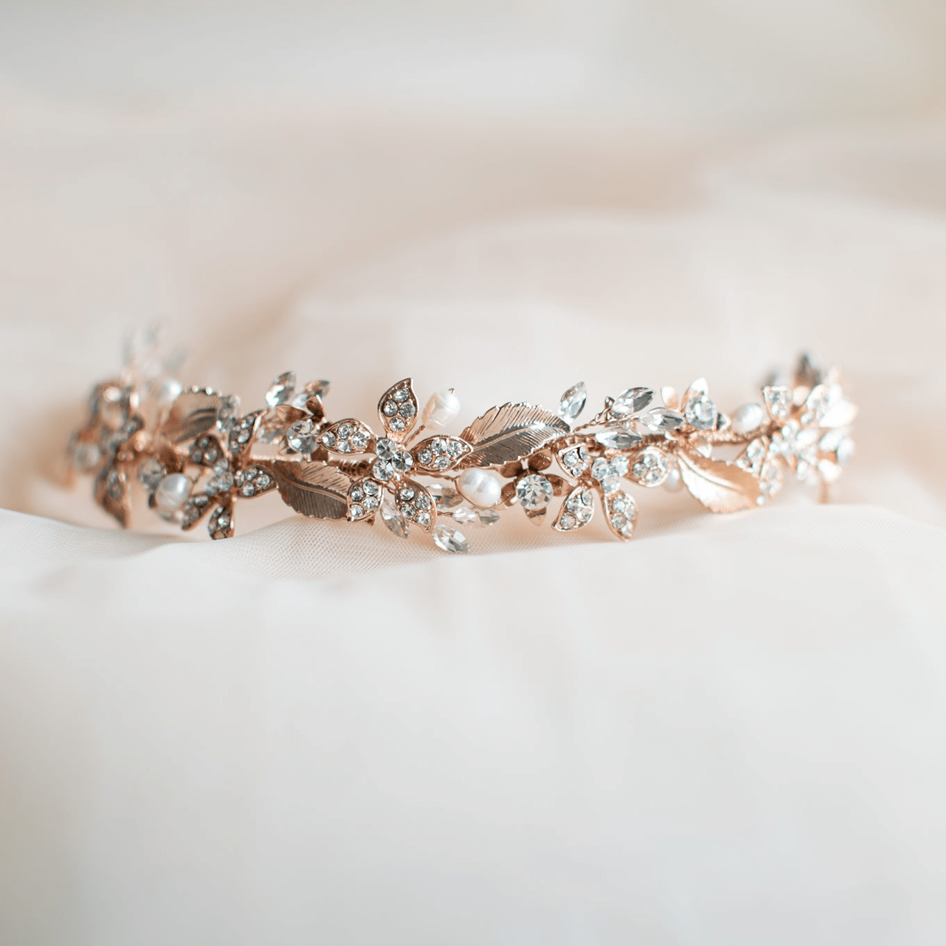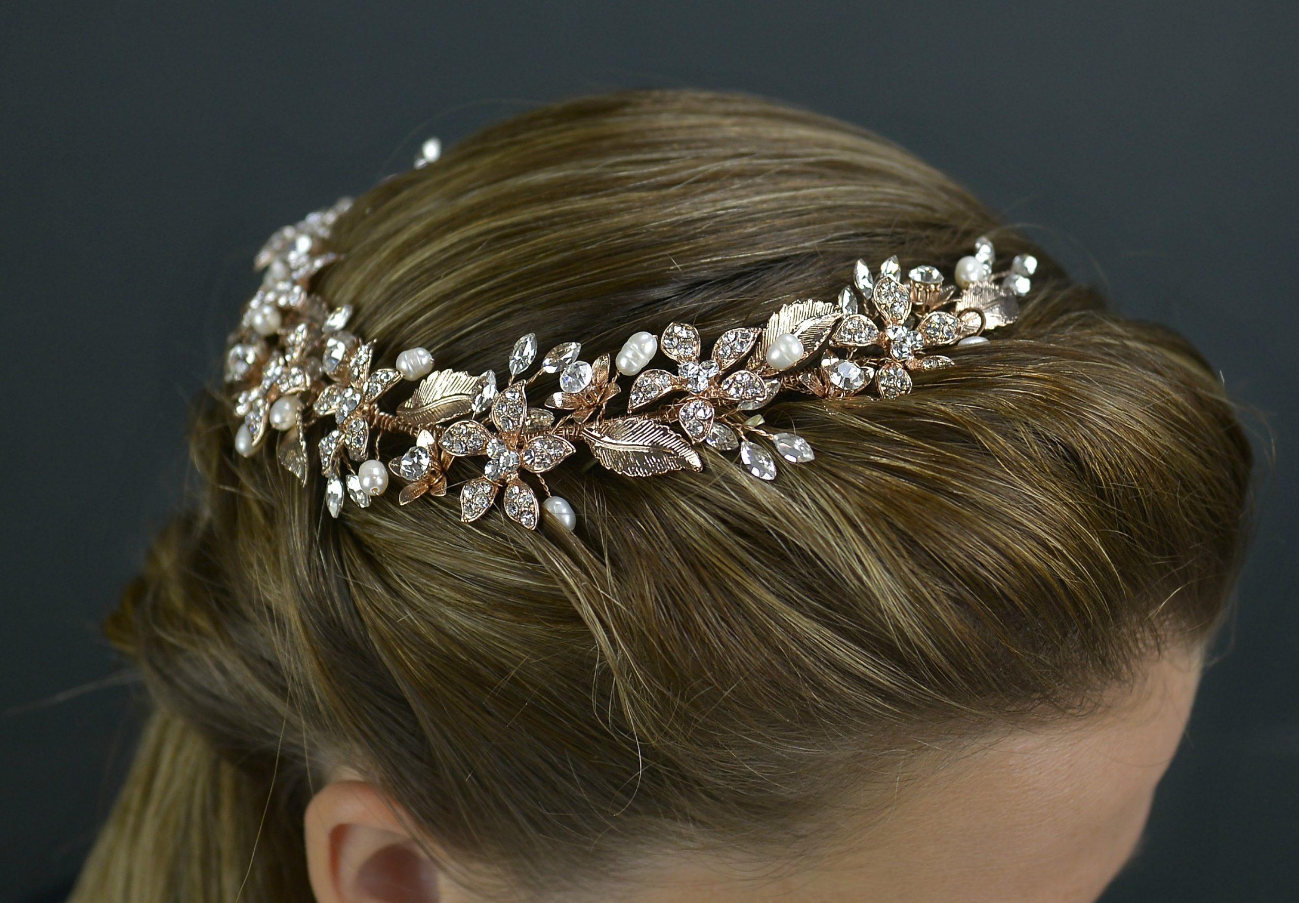 Beautiful Rose Gold hair piece with Diamante and crystal flowers, decorated with Freshwater pearls.