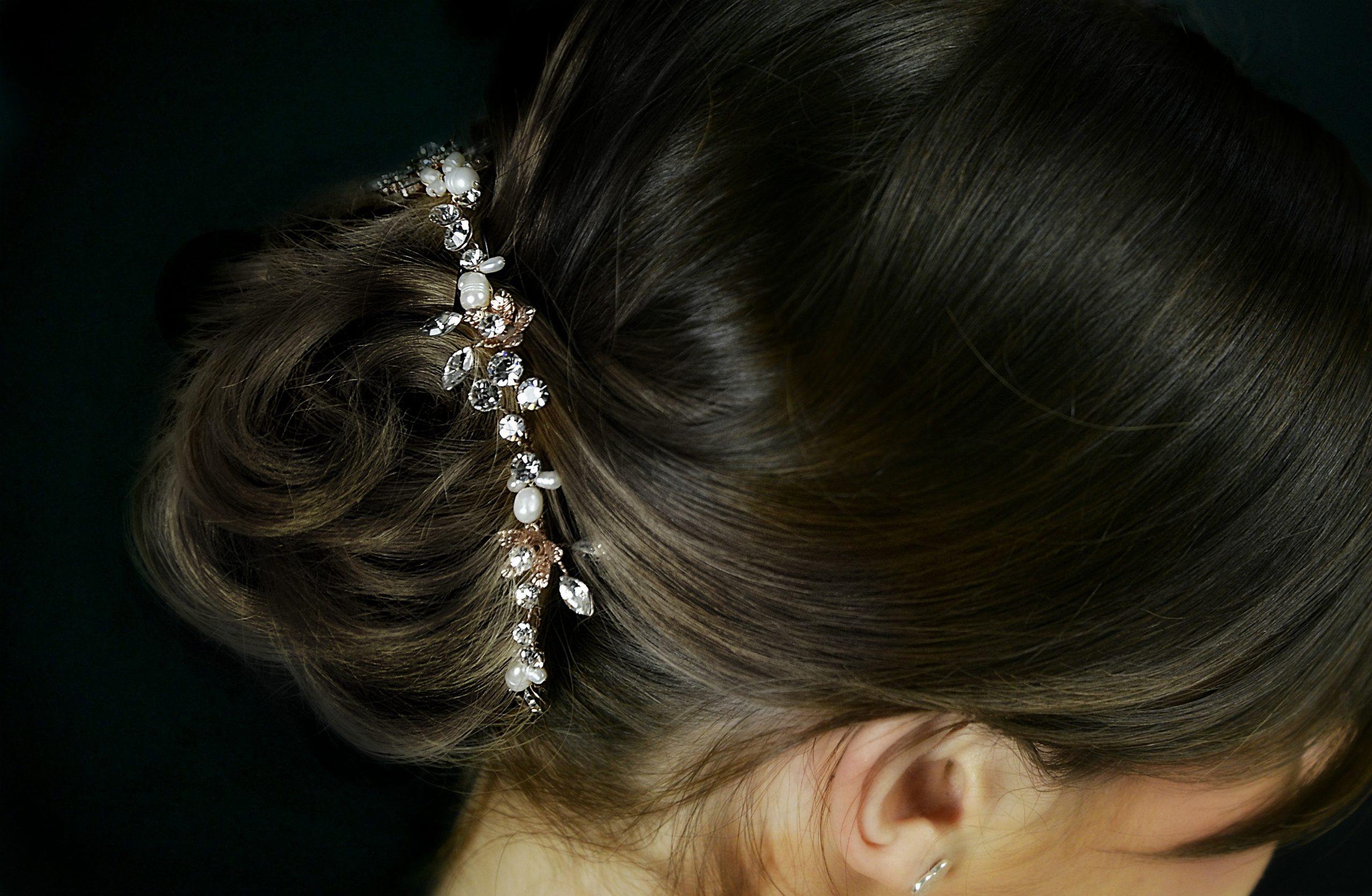 Rose Gold delicate hair piece, filled with Diamante flowers, decorated with fresh water pearls.