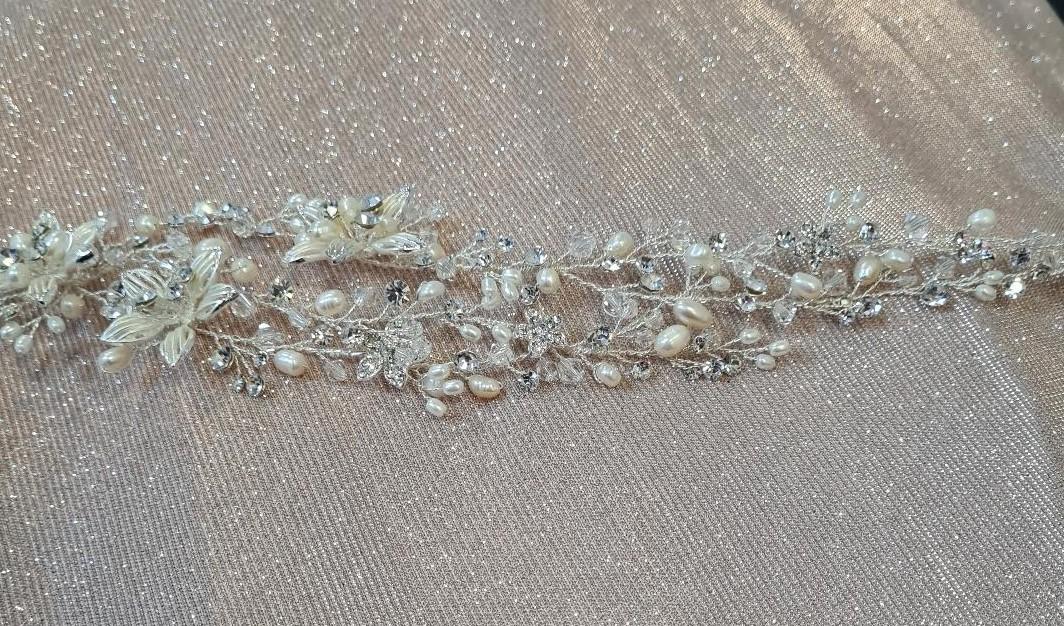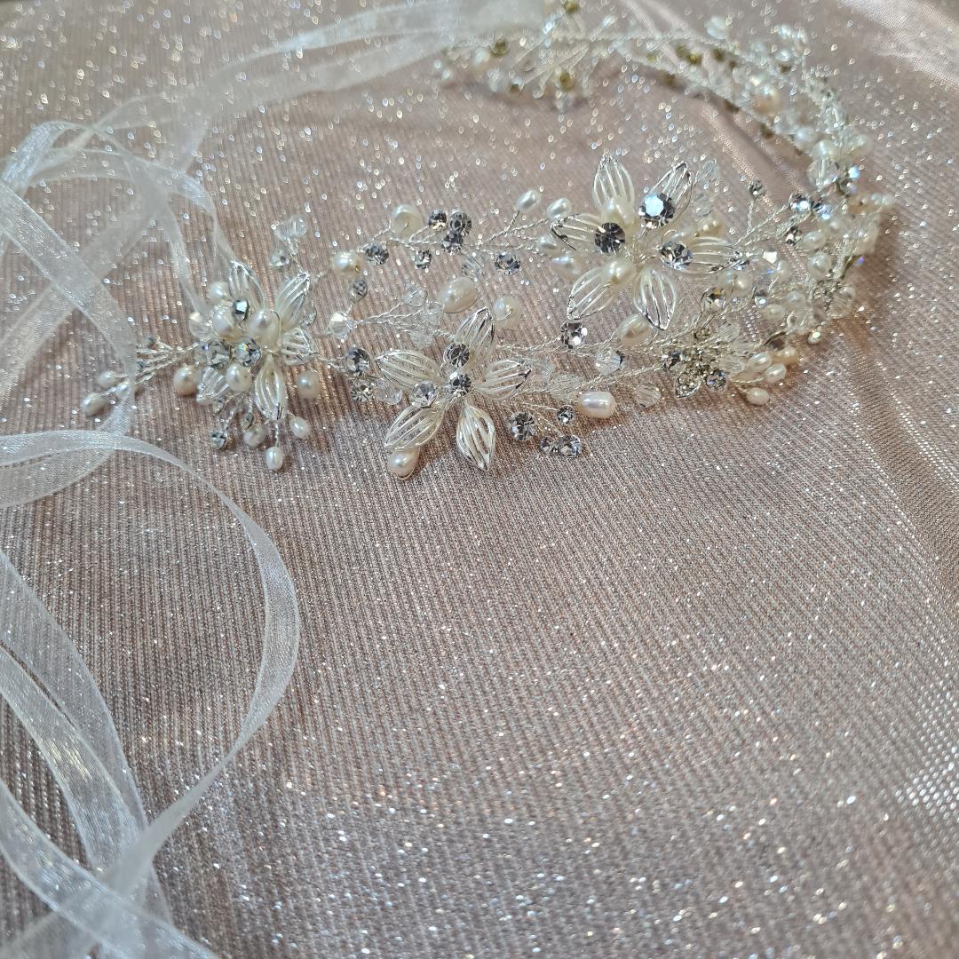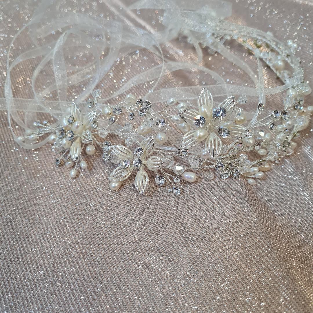 Beautiful hair piece, made up of filigree flowers with Diamante and Pearl centres decorated with a trio of Diamantes, Pearls and clear Crystal beads