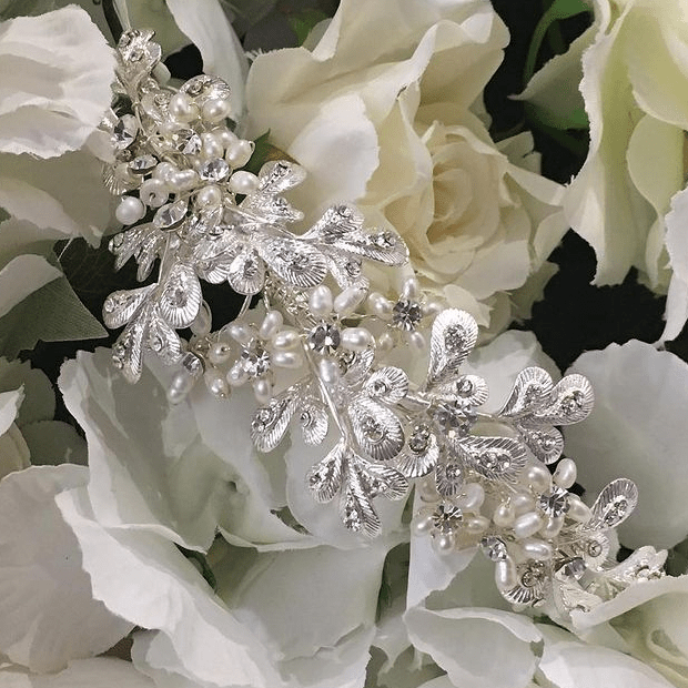 A side tiara decorated with freshwater pearls and diamantes. Intricate silver leaves clustered throughout. 14.5 approximate span of adornments.