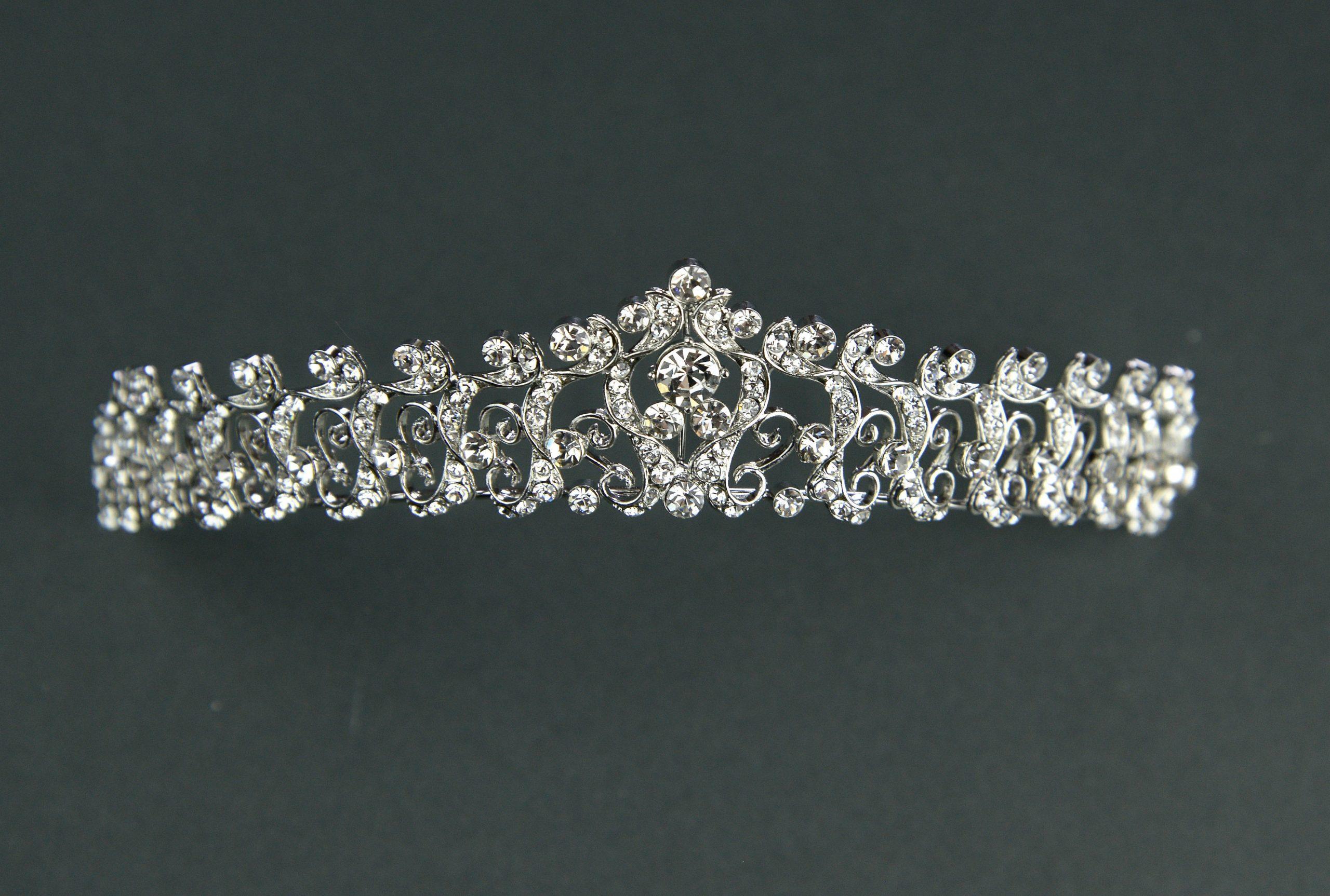 A royal style tiara made up with diamante swirl designs.