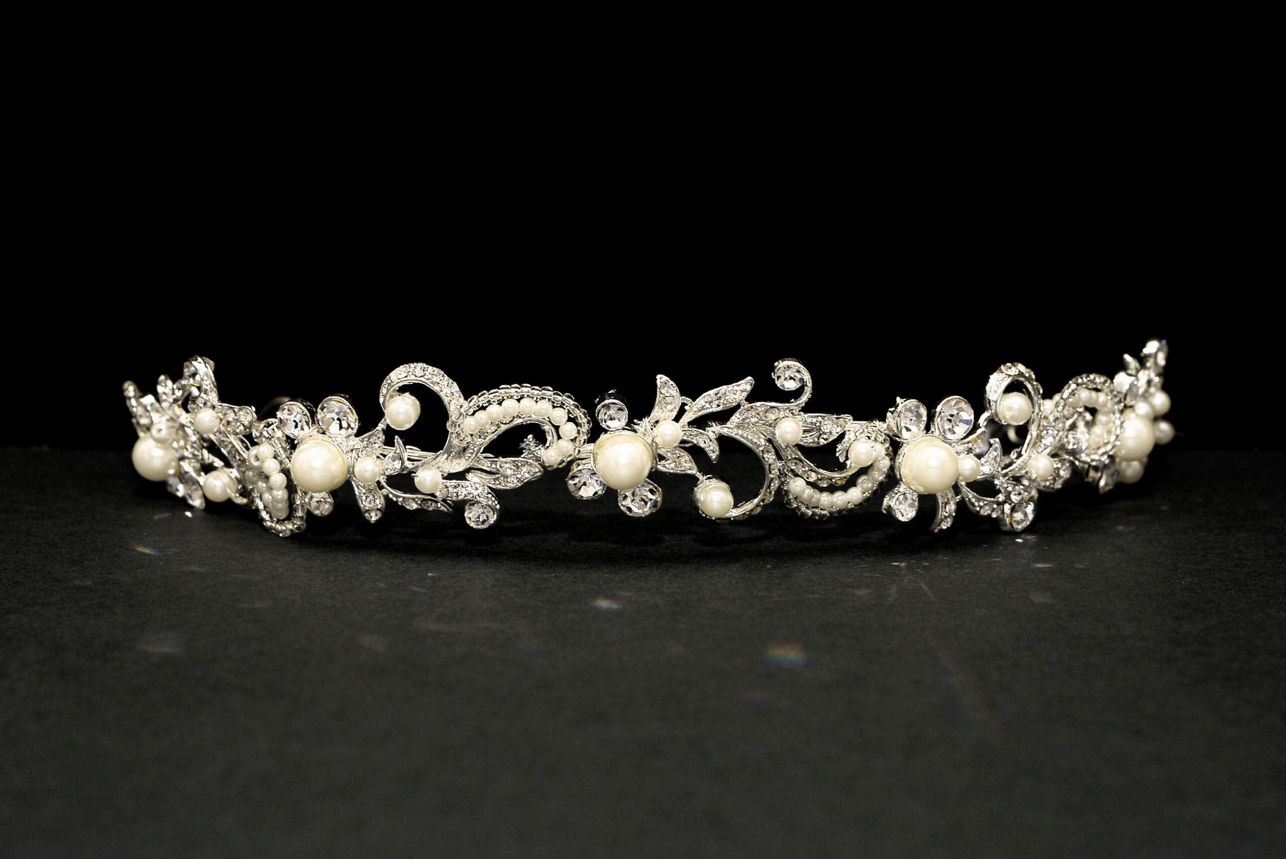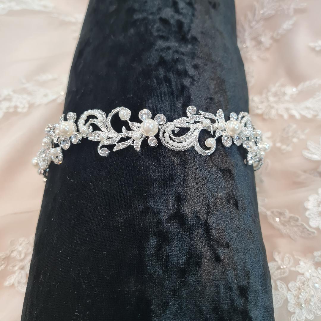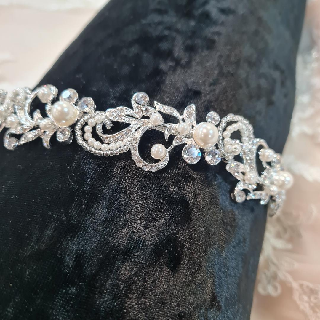 Situated on our signature soft bands. Sets true Gatsby feels with this stunning tiara. Pears, diamantes, swirls and subtle sparkle.