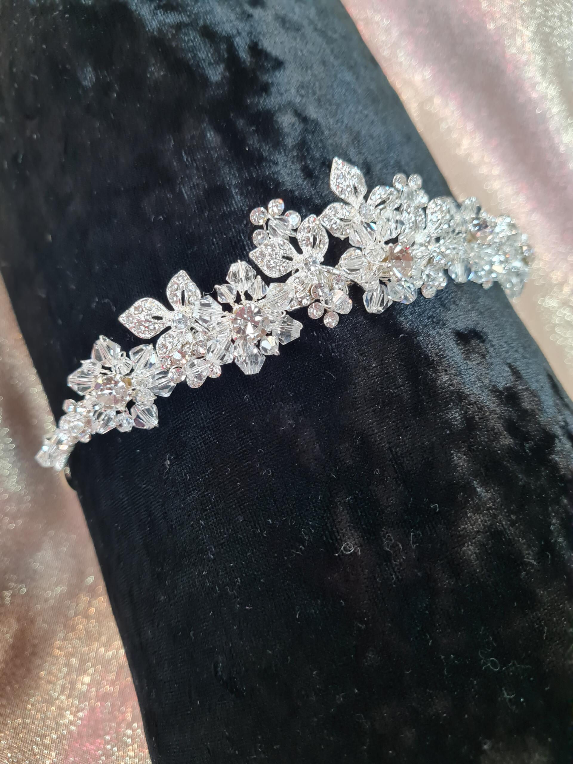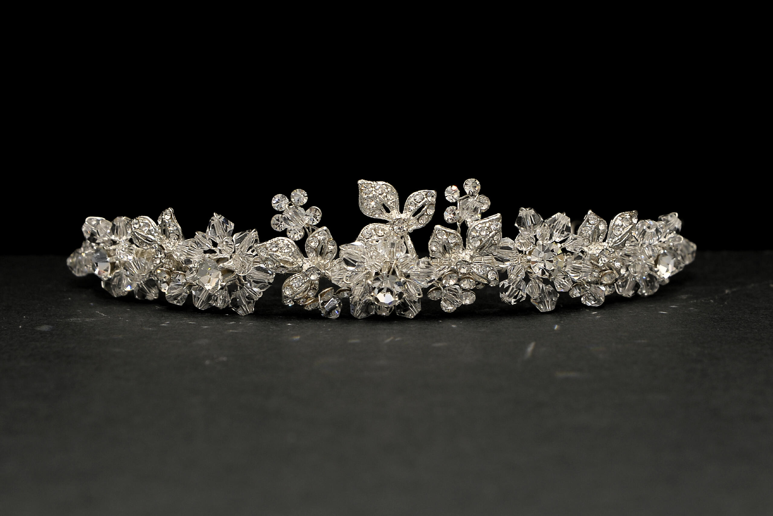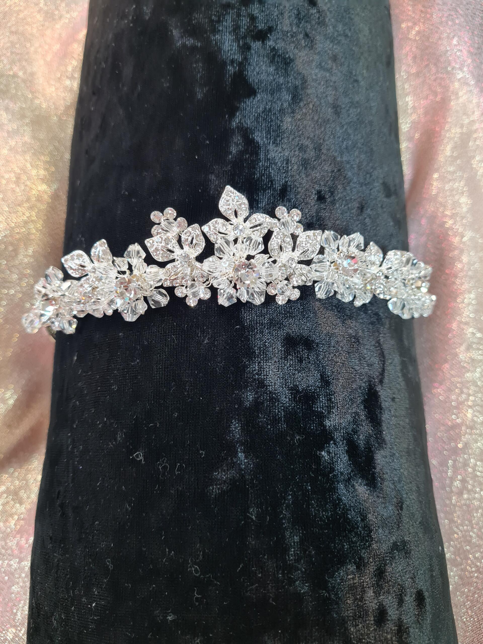 Delicate tiara, flowers in diamante and crystal beads, measuring 1.5″ at the highest point.