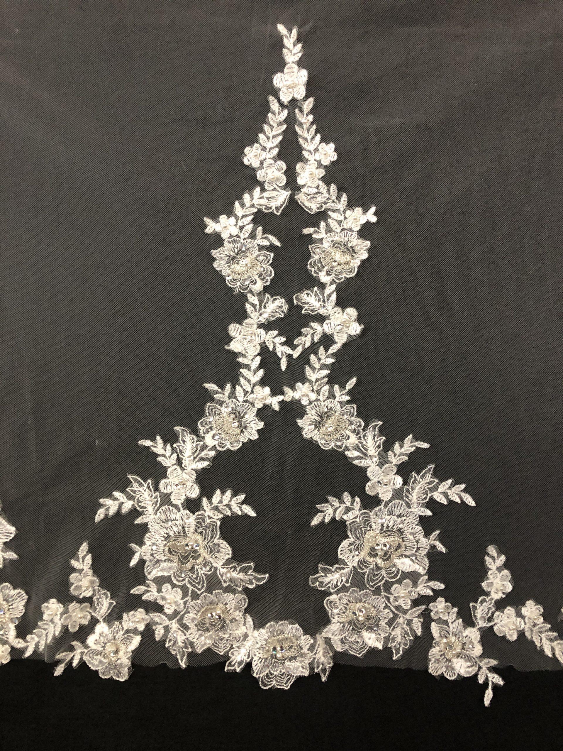 A beautiful lace edged veil, the lace is finished with a Crystal and bead design along with silver thread, making the detail on this veil stand out.