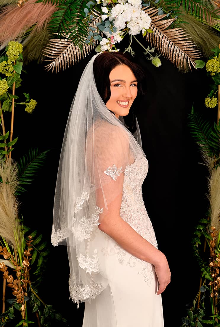 A stunning design with applique lace placed around the edge of the veil.