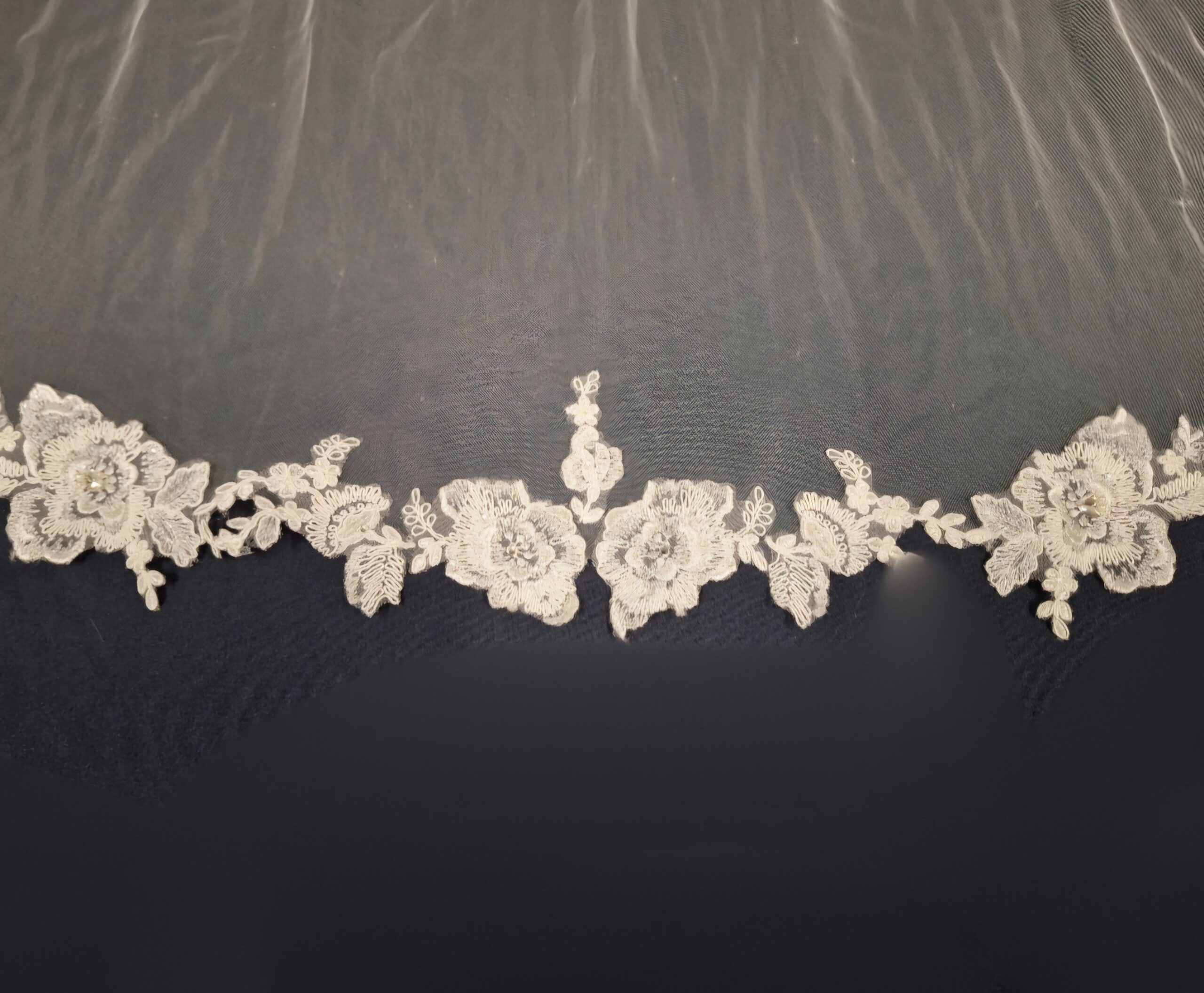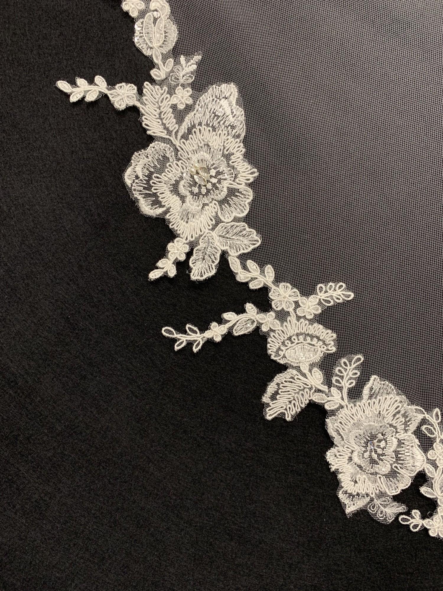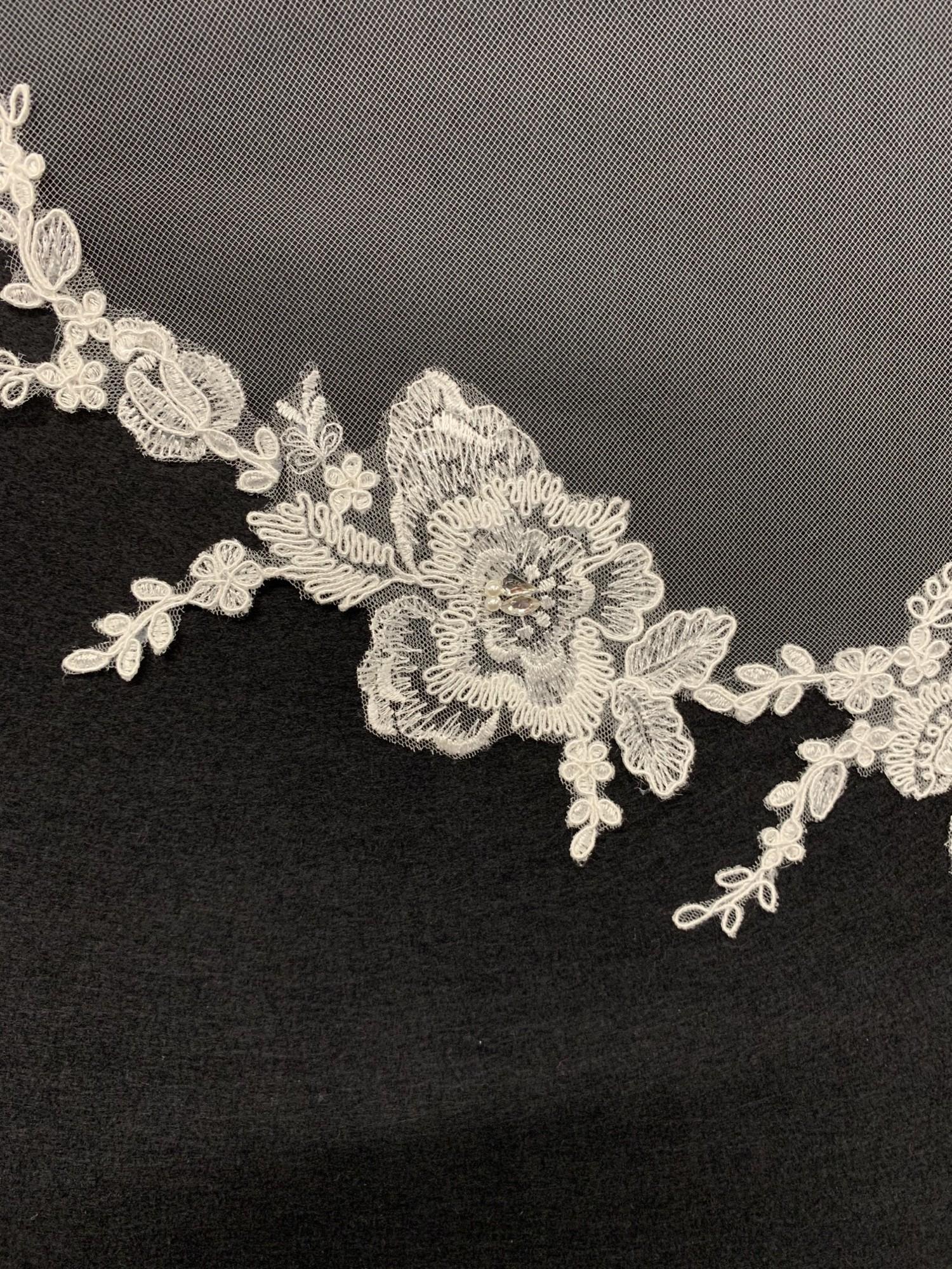 Beautiful traditional veil decorated with applique lace around the edging.