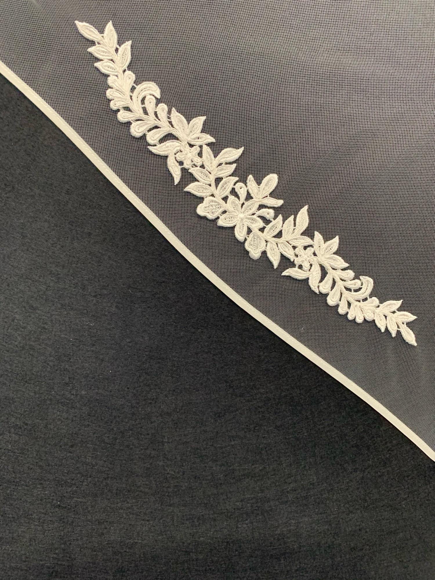 Organza ribbon edged veil with an evenly spaced centre piece lace motif.