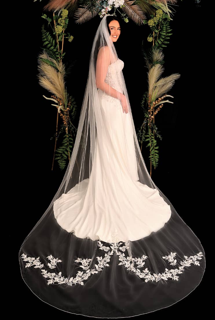 A stunning pencil edged veil with a combination of flower and leaf detail, this veil gives an excellent effect to a bridal gown, making it look look an extra layer on the dress.