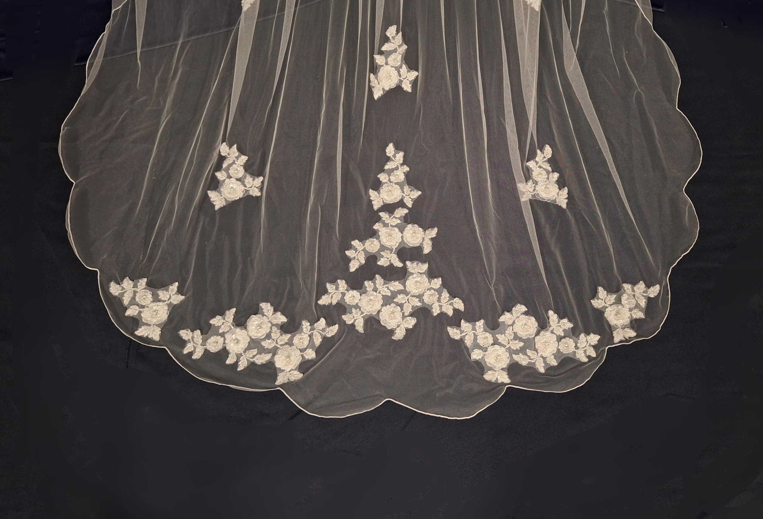 3D flower & lace detailed bridal veil. Available in ivory, blush, champagne or white. Available in 108 ,126 and 144 inch.