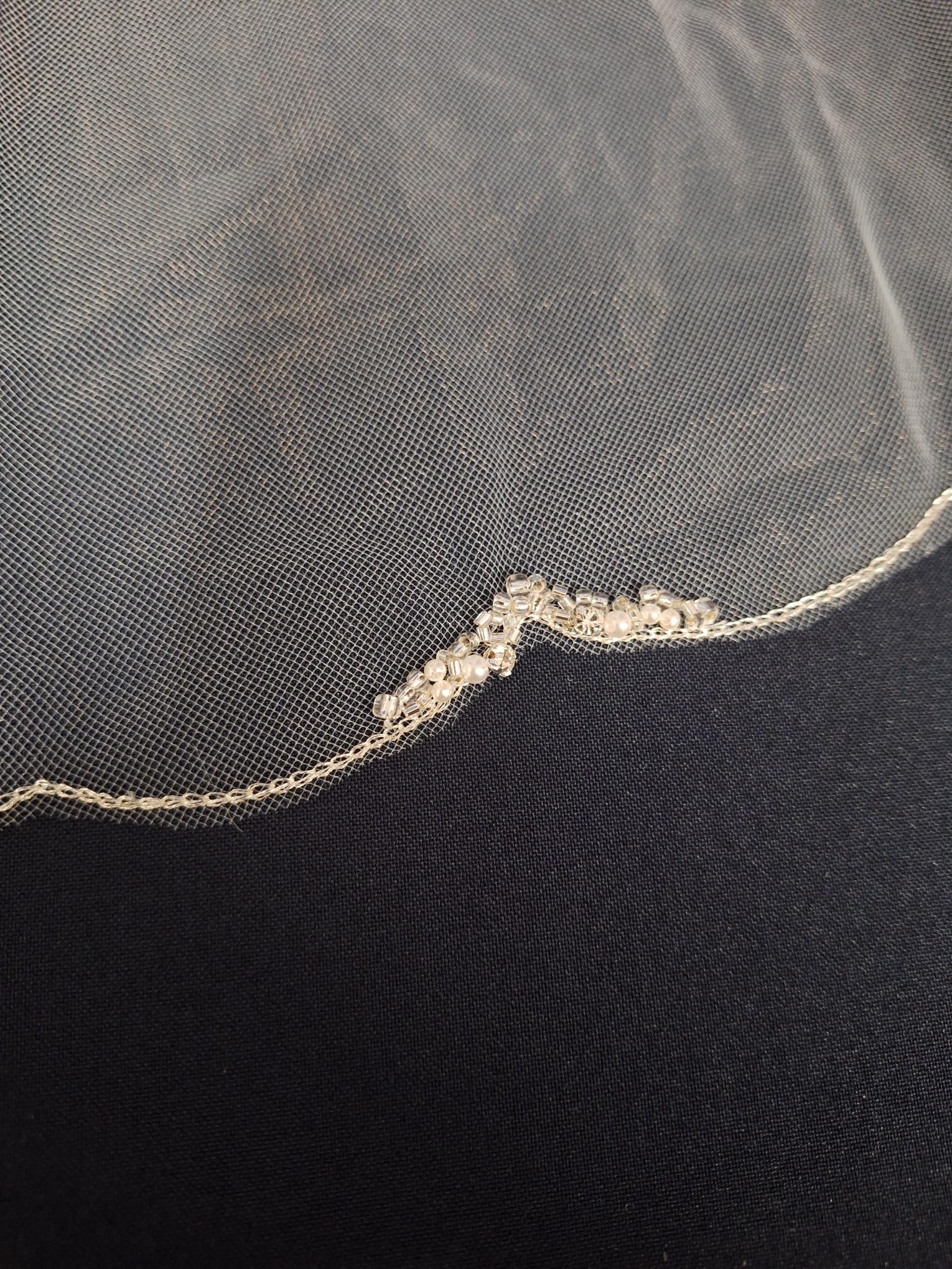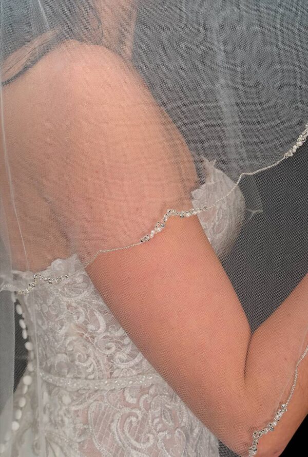 Silver threaded scallop edge veil with crystal, bead and pearl detailing. Available in 54, 72, 108 and 126 inch.