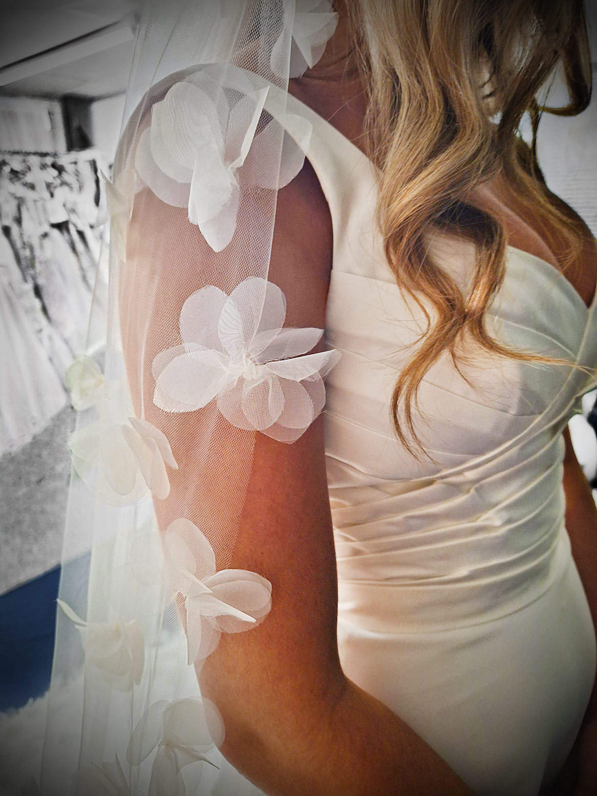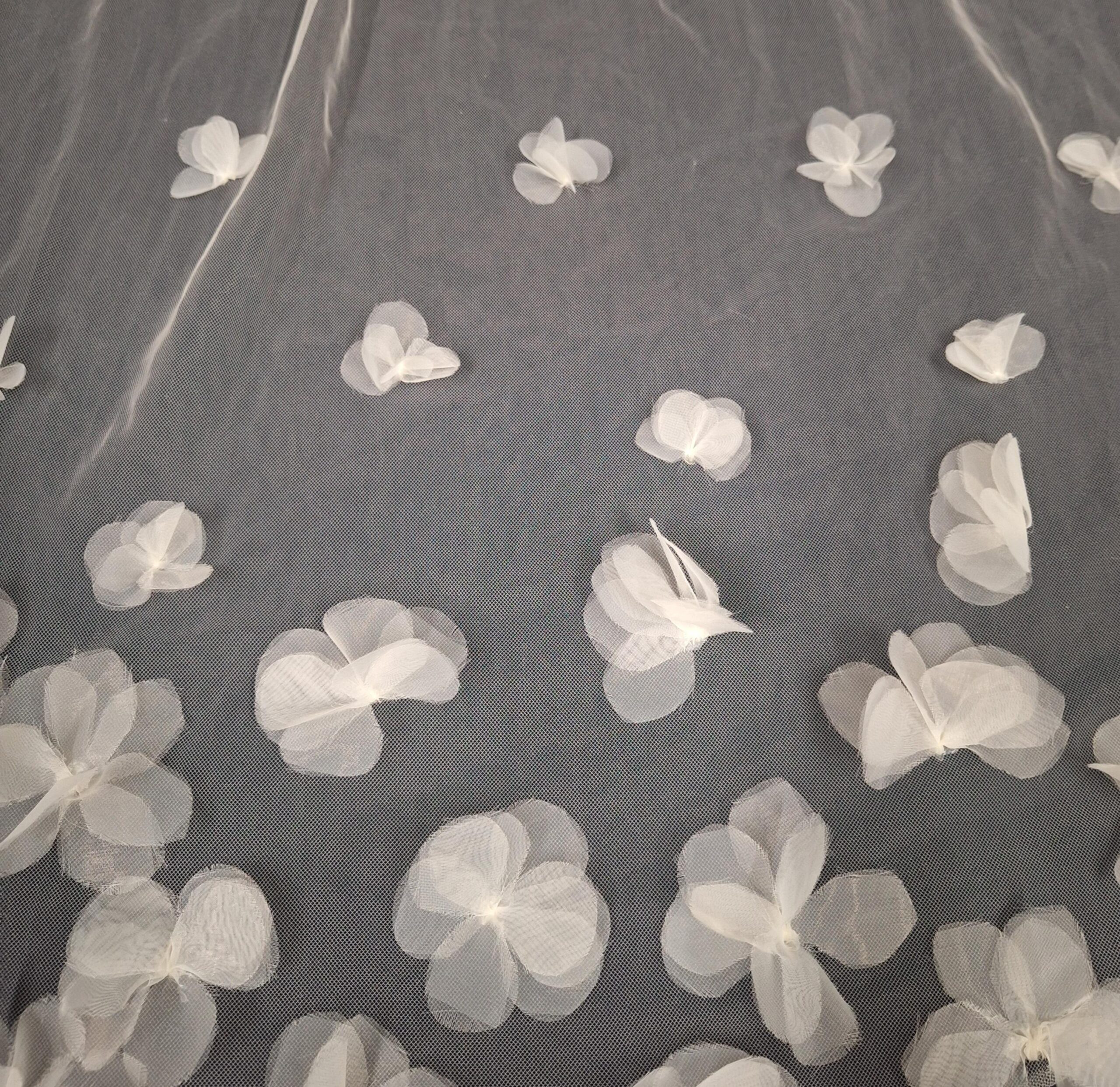 Classy raw cut edged veil, decorated with 3D flowers, a beautiful addition to any dress