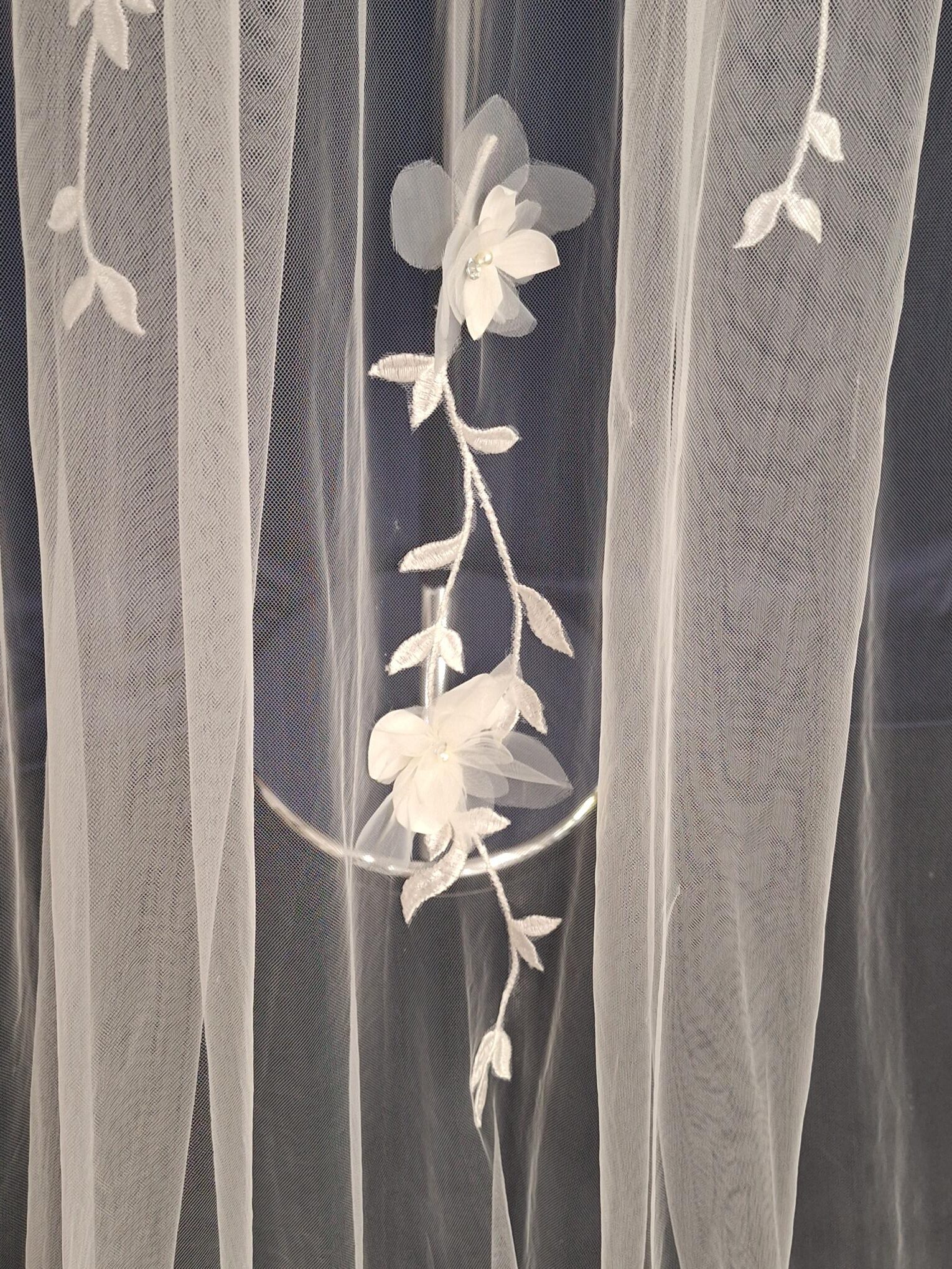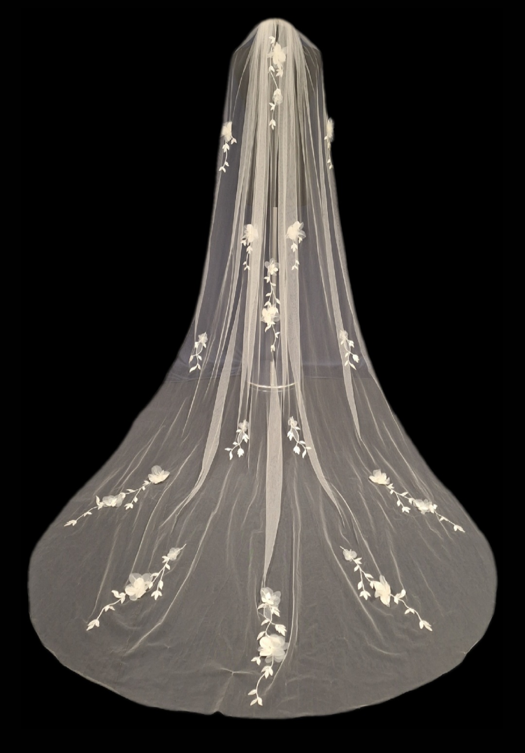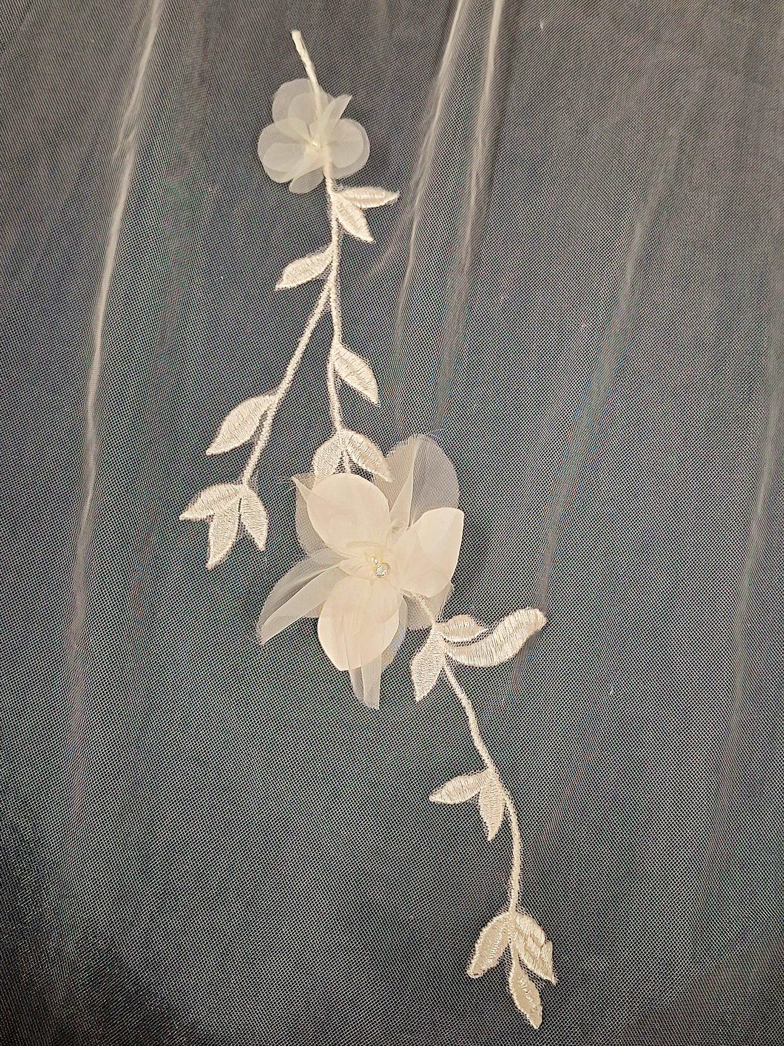 Beautiful raw cut edged veil decorated with 3D flowers with Pearl and Diamante centres and an embroidered leaf design.