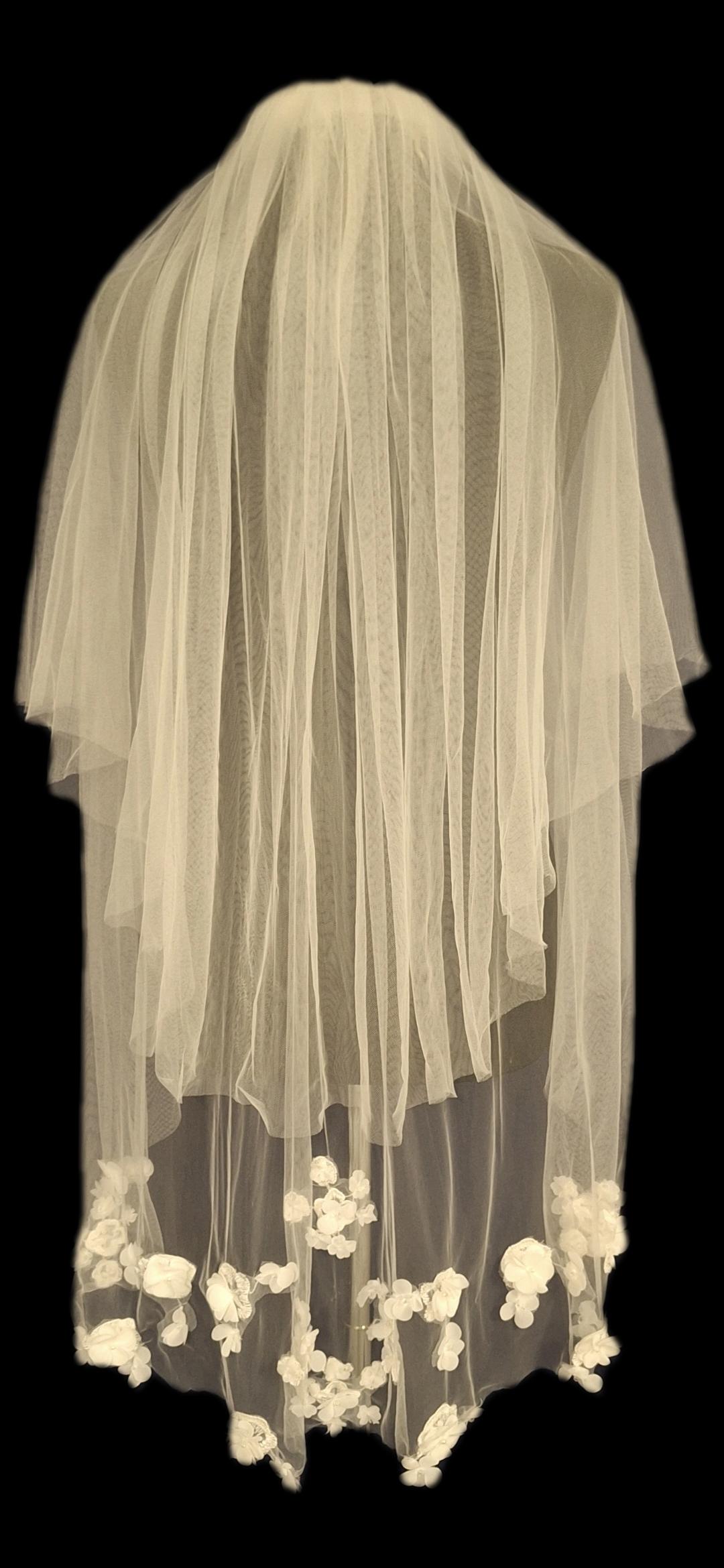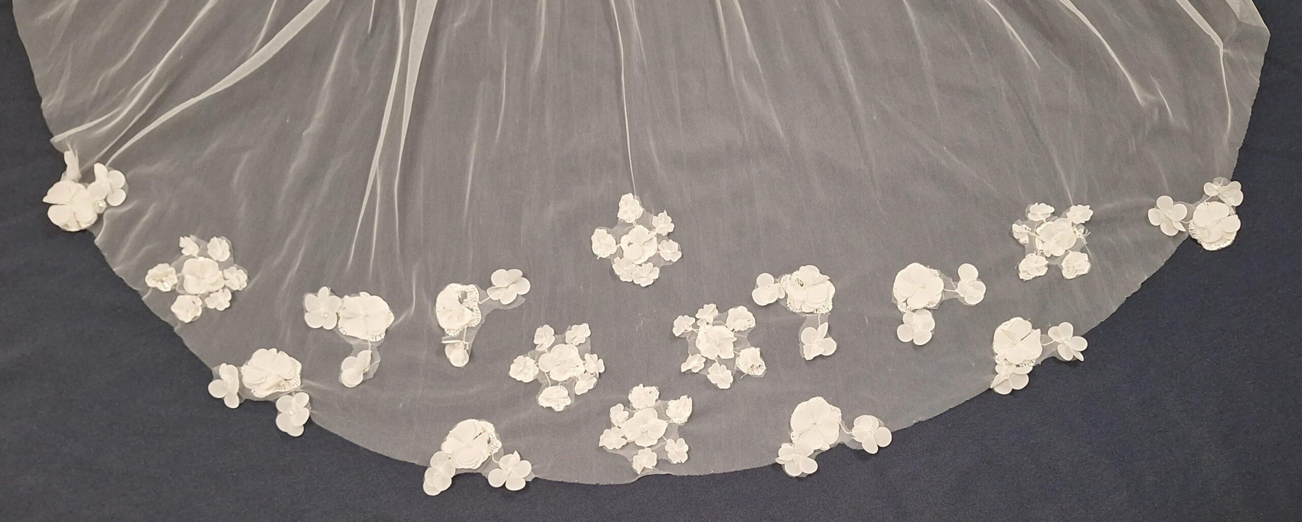 A raw cut edged veil with a beautiful 3D floral motif, added Crystals in the flower centres for extra decoration, finished with added embroidery.