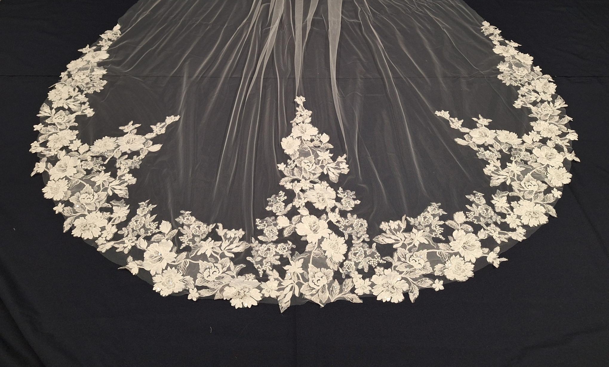Stunning statement lace veil, with large floral motif covering a large section of the bottom of the veil, if you want your veil to stand out, this is the veil for you.