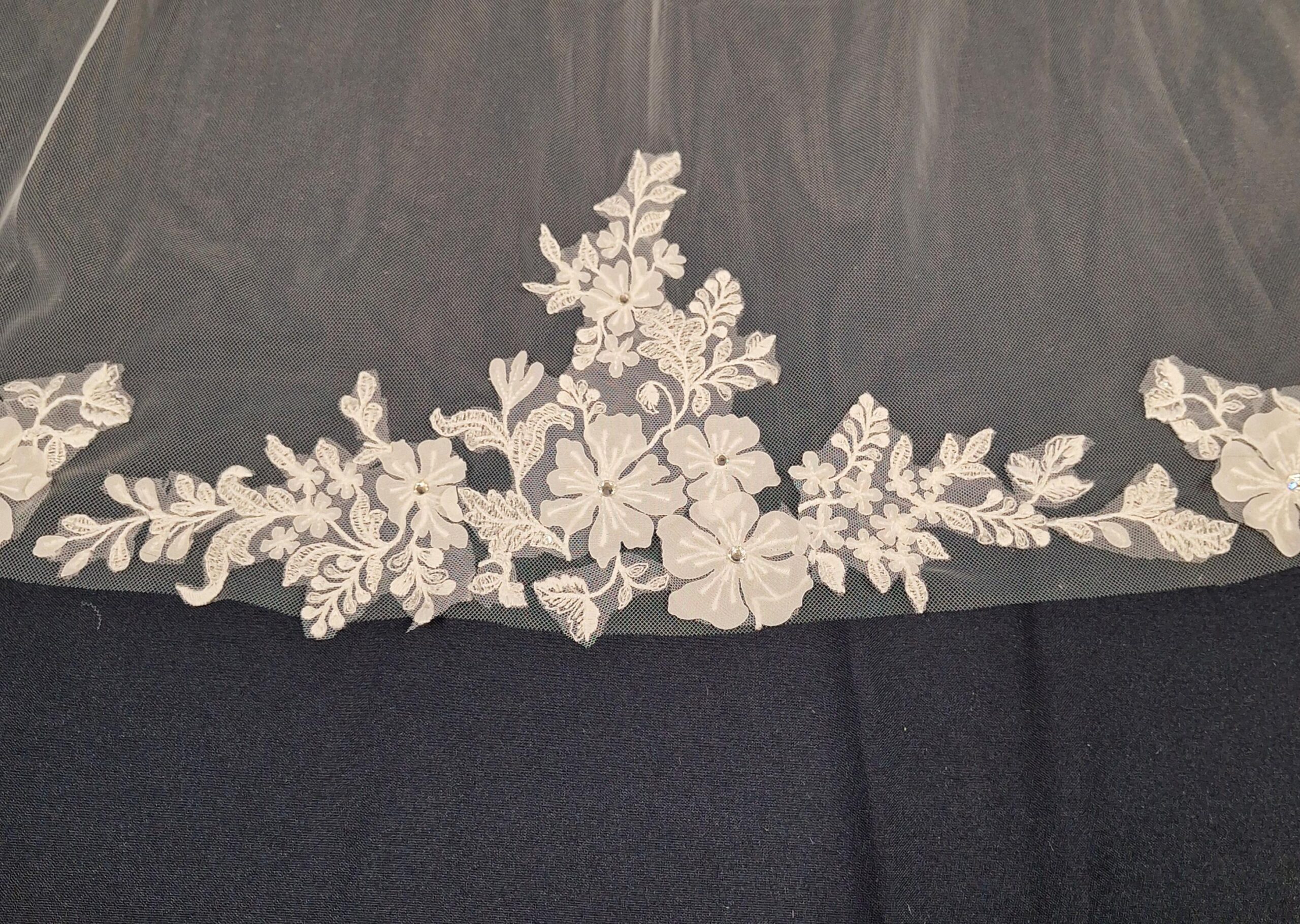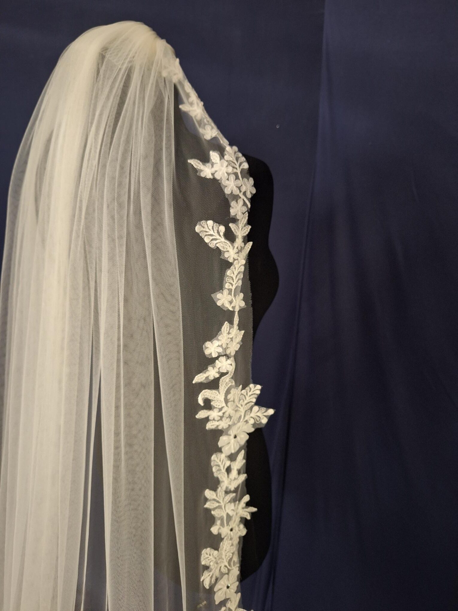 This veil gives the whole wow factor, a beautiful floral lace design which starts from the comb and continues all the way along the edge of the veil.