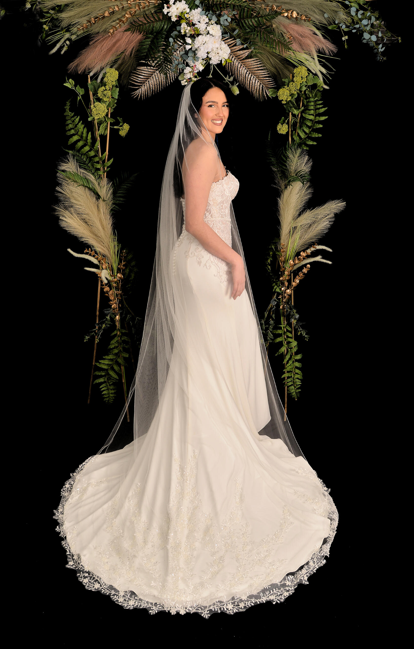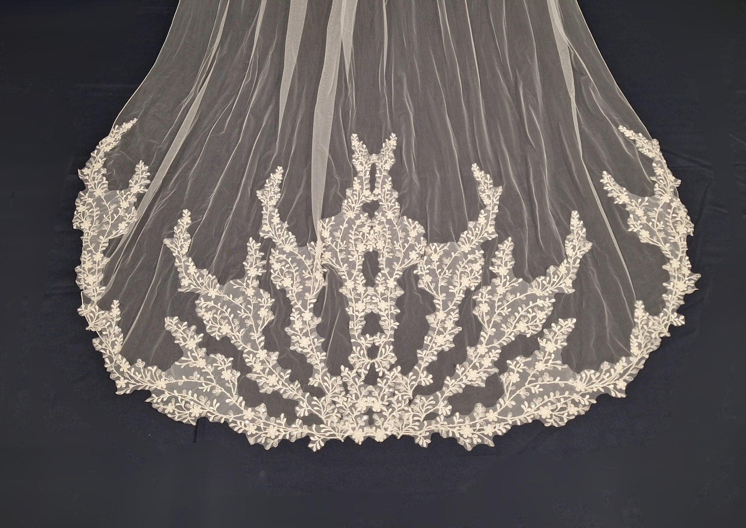 Amazing lace detailed veil, lots of detail goes into this veil, it almost looks like vines going up the veil.