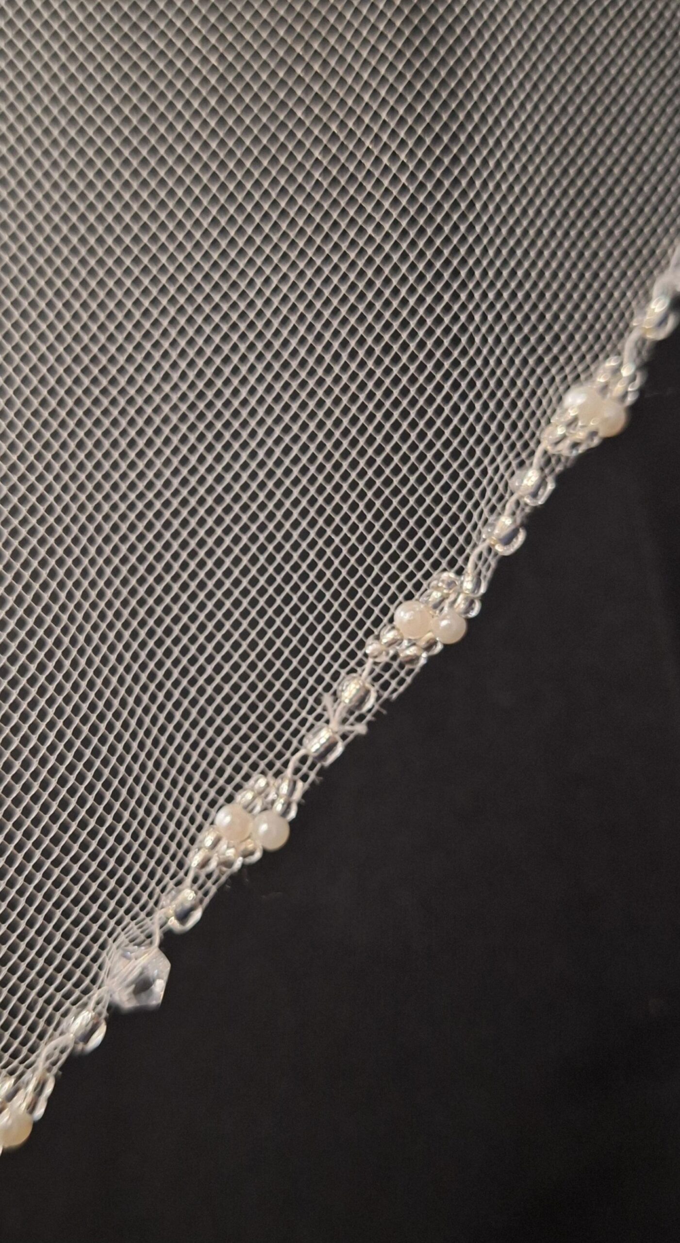 A beautiful single tier tulle veil with pretty sparkle. Featuring a single swathe of ivory tulle edged with dainty ivory pearls, shimmering crystals and tiny beads. This elegant bridal veil is the perfect piece if you’re looking to complement a wedding gown with beaded detail. Available in either waist or fingertip length to suit your attire perfectly.