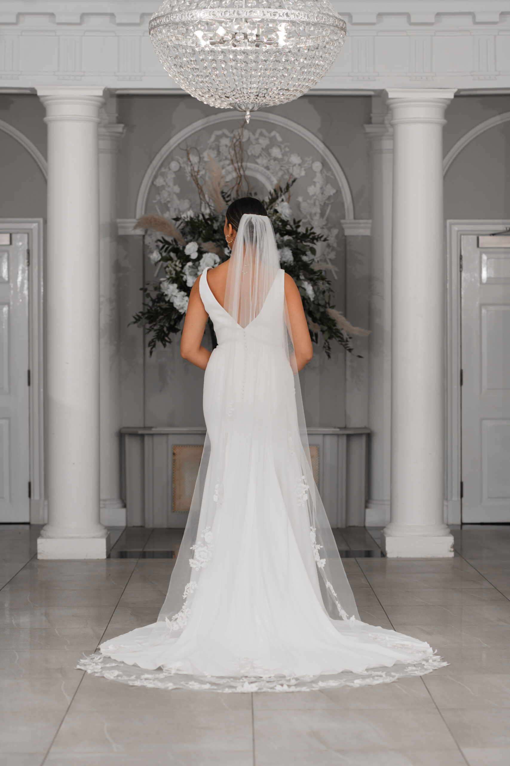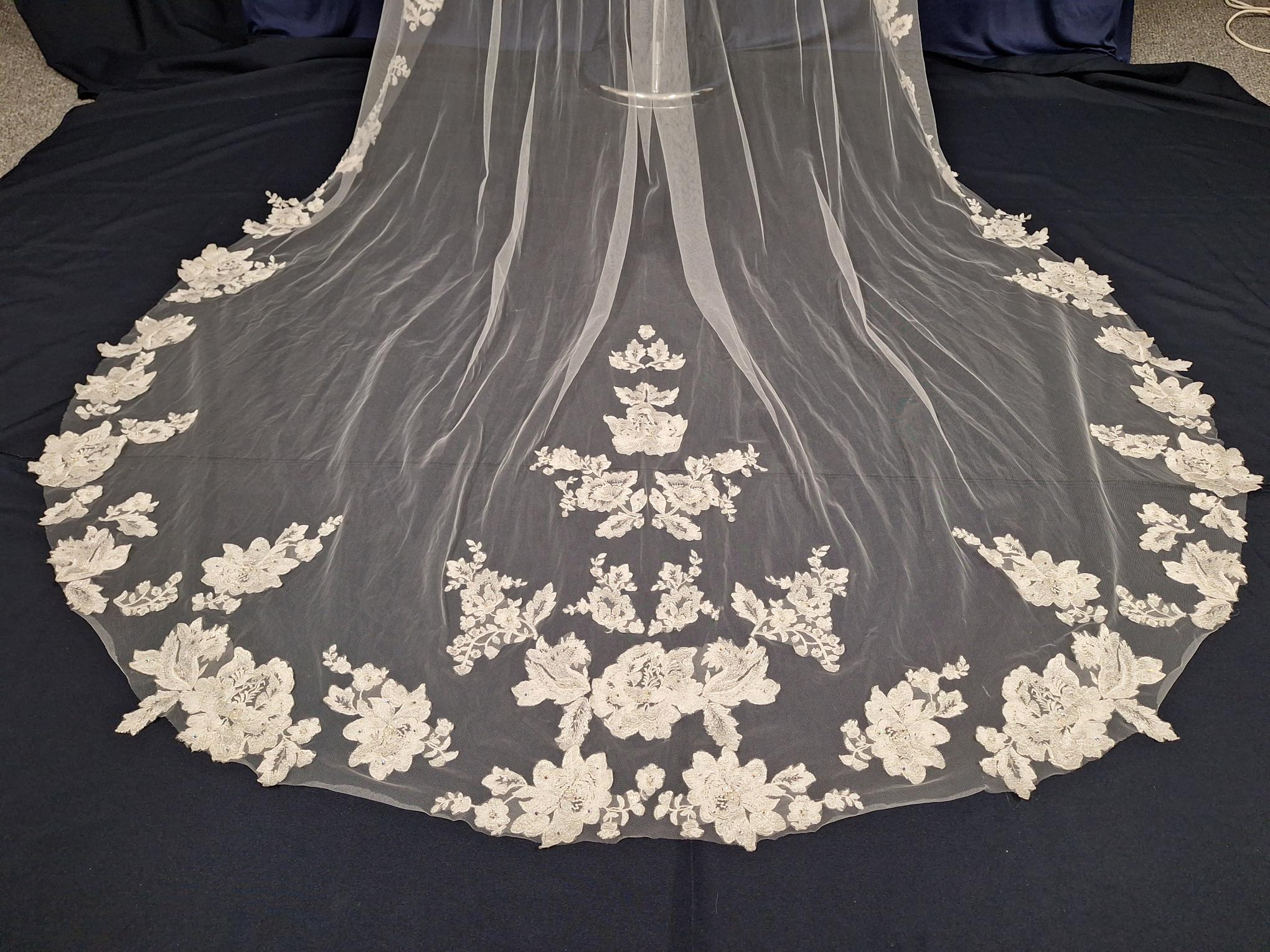 This beautiful chapel length bridal veil has the wow-factor with its hand-embellished floral lace motifs. Handcrafted from a single layer of ivory tulle this veil has a raw edge with the detail beginning half way down the veil. Each motif is decorated with sequins to give a lovely light-catching shimmer. The gorgeous floral motifs create a striking V shape as the focal point in the centre of the train.
